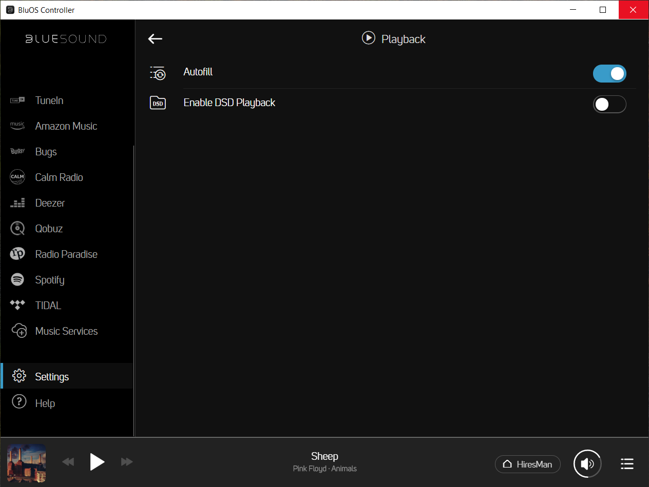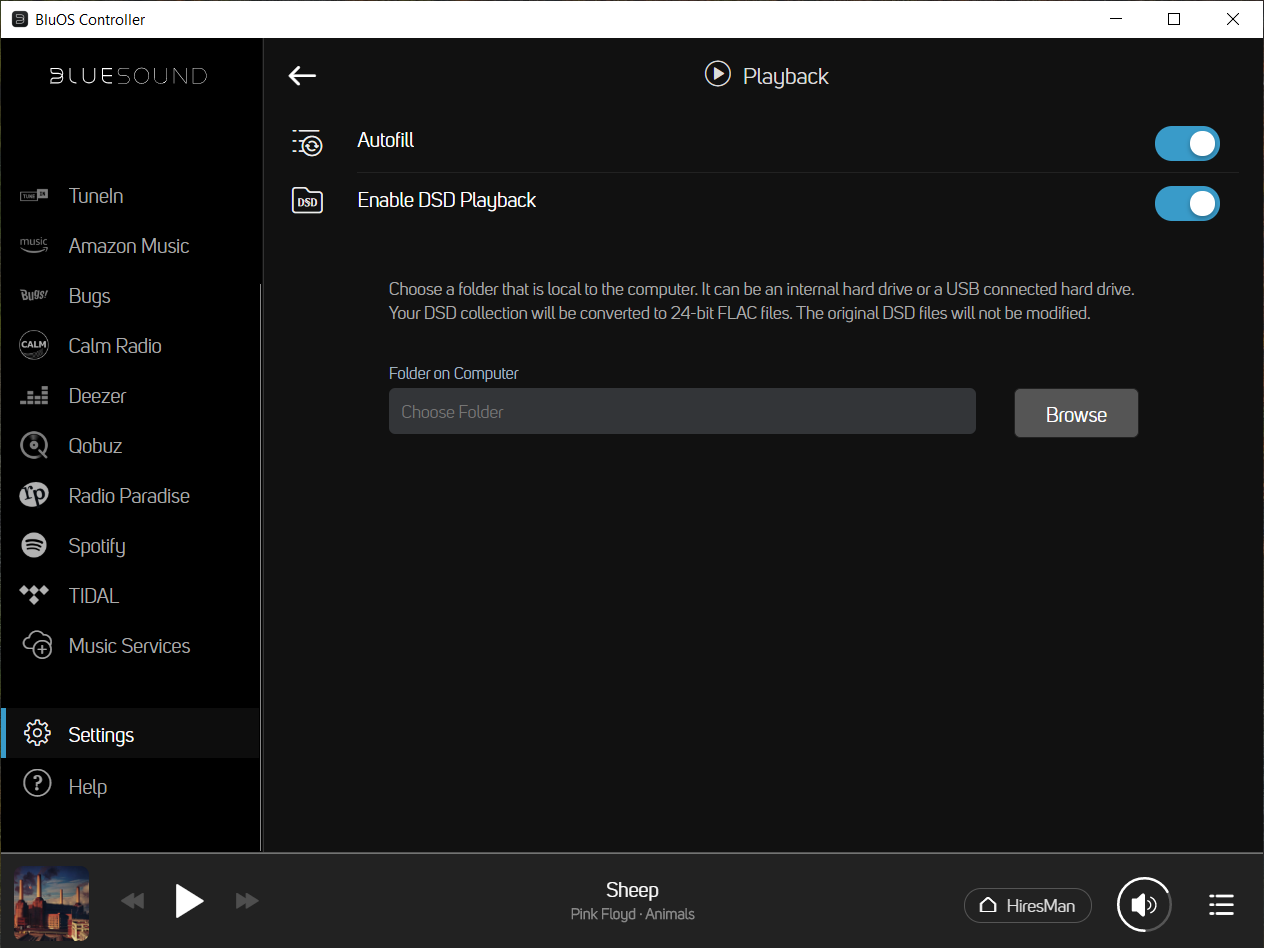 จากนั้นจะกลับมาที่หน้า Setting เหมือนเดิมให้ท่านคลิ้กเลือก ที่เมนู Playback ต่อได้เลย ก็จะเจอหน้าต่างที่มี 2 เมนู ที่จะทำการ ให้แอป BluOS เล่นไฟล์เพลง DSD ได้ ท่านก็เพียงคลิ้กปุ่มด้านขวาของเมนู Enable DSD Playback ให้เป็นสีฟ้า