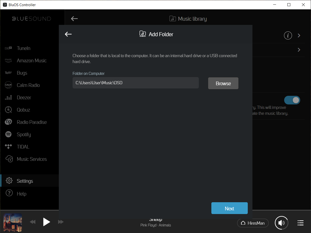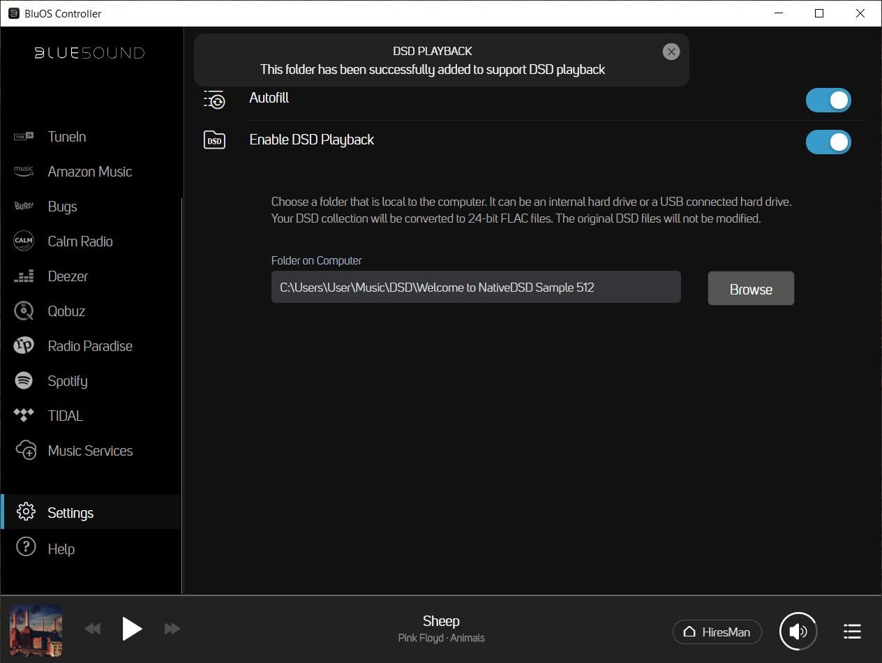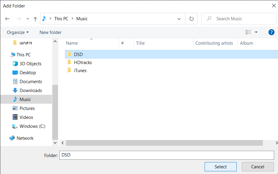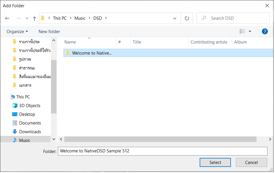 จากนั้นท่านก็ทำการคลิ้กที่ปุ่ม Browse อีกครั้งเพื่อทำการเลือก โฟลเดอร์อัลั้มเพลงที่เราต้องเลือกไฟล์ DSD มาเข้าอยู่ใน Library เมื่อคลิ้กเลือกแล้ว ก็จะแสดง พาร์ทขึ้นมาที่ช่อง Folder on Computer และมีข้อความขึ้นมาด้านบนว่า This Folder has been successfully added to support DSD playback
