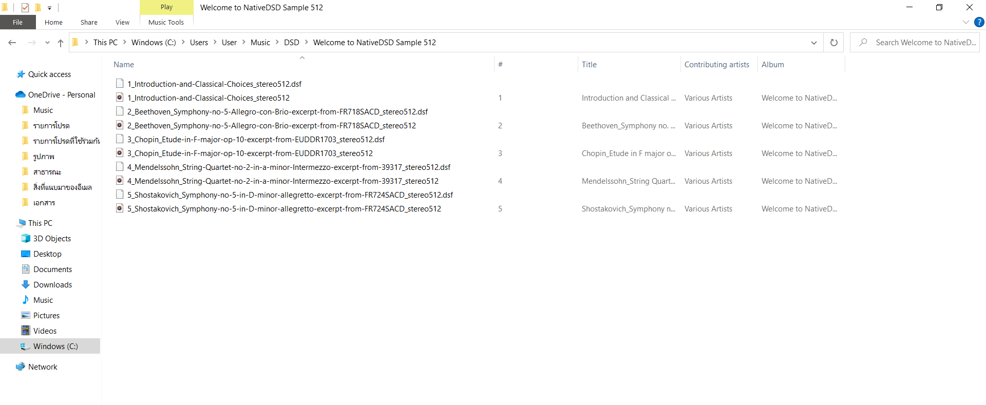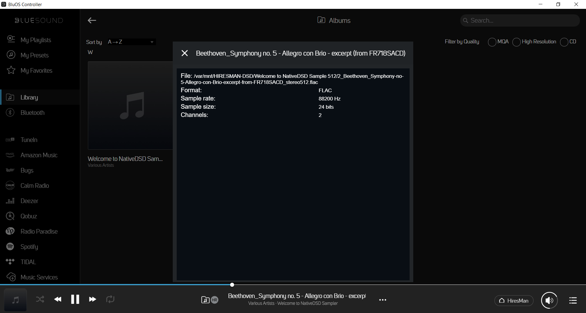 ท่านก็ลองเลือกเล่นไฟล์ในอัลบั้มนั้นๆ ได้เลยครับ นอกจากนั้นเรายังเข้าไปดู Technical info ของไฟล์นั้นได้ปกติว่าไฟล์ มีความละเอียดระดับไหน อย่างในรูป ผมนำไฟล์ DSD 512 มาใส่ ก็จะได้ไฟล์ Flac ไฮเรสที่มีแซมปลิ้งเรท 88,200 Hz ระดับ 24 Bits
