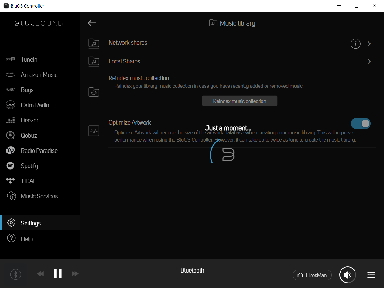 ให้เราไปที่ เมนู Setting อีกครั้ง แล้วเลือกที่เมนู Music Library แล้วทำการ คลิ้กที่ ปุ่ม Reindex Music Collection เมื่อทำการคลิ้กแล้ว ก็จะมีข้อความ Just a Moment… เพลงยิ่งมากก็จะใช้เวลามากเป็นปกติ จะเป็นแบบเดียวกับเวลาที่ท่านเอา Ext.Harddisk มาต่อที่ช่อง USB ด้านหลังของเครื่องเล่น Bluesound แล้วทำการ รีอินเด็กซ์ เพื่อให้อัลบั้มต่างๆโชว์ขึ้นมา