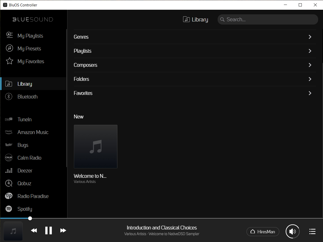 เมื่อลงโปรแกรมเสร็จ ท่านก็ดับเบิ้ลคลิก เปิดโปรแกรมขึ้นมา ก็จะเจอหน้าหลักแบบนี้ สำคัญ เครื่องเล่น ทั้ง Bluesound NAD ต้องอยู่ในวงแลน เดียวกับ เครื่องคอมฯ ก่อนนะครับ ไม่อย่างนั้น ตัวโปรแกรมมันจะมองไม่เห็นเพลย์เยอร์แน่นอนครับ อย่างในรูปมุมขวาล่าง ตรงปุ่มโฮม ของผมก็จะเจอเครื่อง Node2 ที่ผมตั้งชื่อ HiresMan ไว้ ถ้าจะก็เล่นเพลงก็สามารถได้เลย การใช้โปรแกรมก็ แทบจะเหมือนบน แอปบนสมาร์ทโฟน หรือแท็บเล็ตทุกอย่างครับ
