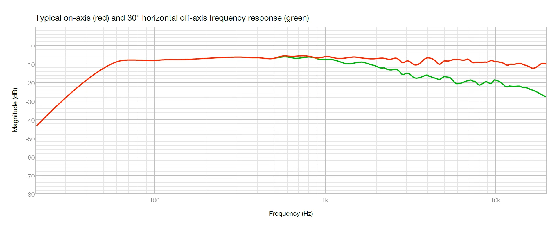แผนภาพด้านล่างแสดงการตอบสนองความถี่ของลำโพงทั่วไปที่วัดได้โดยการวางไมโครโฟนไว้ด้านหน้าโดยตรง (เส้นโค้งสีแดง) และด้านข้าง (เส้นโค้งสีเขียว) เส้นโค้งสีเขียวแสดงให้เห็นว่าเอาต์พุตของลำโพงลดลงเมื่อความถี่เพิ่มขึ้น